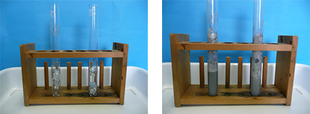 | 写真1 鉄+塩酸(3%) | 結果(1) 100mg → 0.2g | 結果(4) 500mg → 0.5g | ||