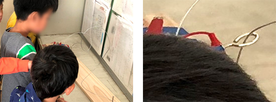 子供たちは,自分で作ったテスターで楽しそうに電気を通す物や通さない物を調査した。そして,電気を通す物は金属であるという結論に至り,イライラ棒の途中にビニルテープを巻くという案で,休憩所を作った。