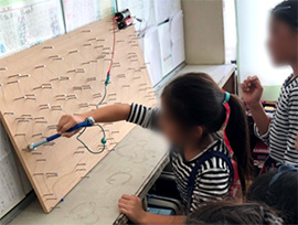 豆電球と乾電池を「わ」のようにつなげば,豆電球に明かりつくことを学習し,次に子供たちは「イライラ棒に休憩所を作りたい」という思いがさらにふくらんできた。そこで,どんな物が電気を通すのか,または通さないのかを調べるために,全員で写真4の牛乳パックテスターを作った。