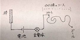 電流イライラ棒は,自分が持っている金属の棒を他の金属に触れないように進ませるという遊びである。3年生ではまず豆電球について学習するため,金属同士が触れた場合には豆電球を光らせるようにする。