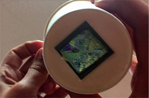 偏光板を2枚用意し,プラ板にセロハンテープをぐるぐる巻きにして光を曲げることで光がいろいろな方向によじれ,その結果色が違って見える(紙コップを回すことで)性質を利用して万華鏡を作る。小学生には「偏光」「偏光板」という用語は難しいため,あちこちに向いている光のうち,一定方向の部分をカットできるフィルムだ…という程度に留める。セロハンテープは繊維を引き延ばした物なので,これも光の向きを変えることがある。それがあちこちに貼られているので光が曲げられ,発色するというくらいの説明をする(高学年のみ)。