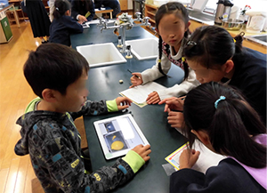 「理科的環境を整えて,子どもが自ら授業を創る」をテーマに2年間取り組んできたが,一言で「環境を整える」と言ってもなかなかそれは大変なことであった。生き物は世話をしないと死んでしまうし,同じ物が長い間あっても飽きてしまう。本当に樹木や野草に興味を持ってくれるだろうか,メダカのクイズなんてできるのだろうか,不安と疑問だらけのスタートであったが,やってみると意外と子どものノリは素晴らしく,次々とこちらの思う以上に活動してくれた。新指導要領も公布され,英語や教科としての道徳など新しいことが目白押しのこの2年間,とても忙しいのに理科のことに特化して全教員が動いてくれるのだろうかとも正直心配だったが,これも意外や楽しんでやってもらえた。最終的には授業に行き着くのだが,まなボードやiPadを用いることで確実に協働学習の形は整い,ICT環境の充実により,発表の形が整った。ネタ探しが大変ながら楽しみにしてくれるSFは今後も続けようと考えている。子どもたちが理科を教科だけの理科でなく,日常の科学として捉え始めてきた今だからこそ,さらに取組を充実させる適期となったと考えている。