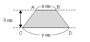 - ① 台形の上底をxcm,下底をycmとしてx,yを用いて台形の求積公式を表す。(高さは3cmと決める。)