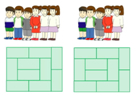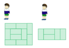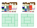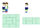 画像3 畳だけを提示する![]() 画像4 人を左,右と表示する ![]() 畳の枚数と人数を関連づけて比べることに気づかせる。 画像5 左の人数を増やす ![]() 計算に気づかせる |