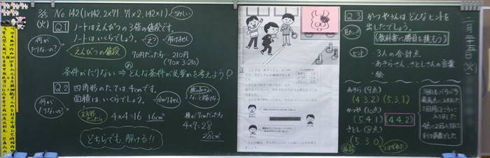 「あきらさんが正しいとすれば・・・」「さとしさんのヒントと絵を照らし合わせると・・・」など,論理的に解決していく姿がめざされる。