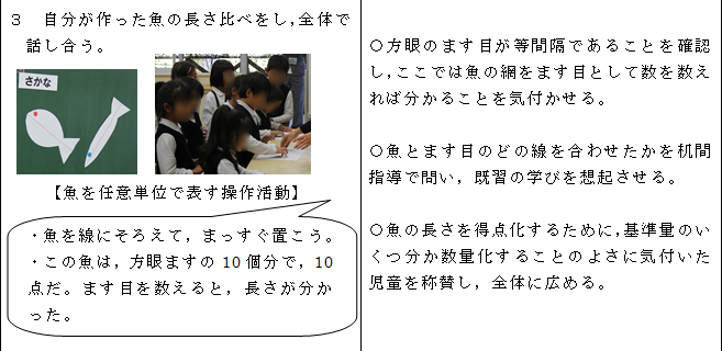 本時は,これまでの学習を活用する場として,操作活動を取り入れ,知識や技能の定着化,一般化を図る。生活科で使う魚釣りに必要な道具の長さの比較や魚の長さを得点化するために測定するという場面を設定し,既習の長さの比較や測定の仕方と,出合った問題場面とをつなぎ,比較や測定などの算数的活動を行いながら場面に応じた方法を思考させる。