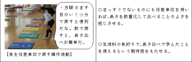 また,秋のおもちゃ遊びで友だちに魚釣りを楽しんでもらおうという目的意識をもたせることで,関心・意欲を高めるとともに,長さを正確に測定することへの必要感をもたせることができる。