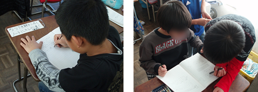 1時間目に学習した内容や,教科書に出ている他の例も参考にしながらそれぞれ取り組んだ。題材を何にしようか迷ったり,式や表に表せなかったりする児童に対して,周りの児童がアドバイスをしている様子が見られた。