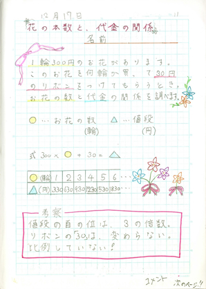 3つ目の問題は「1こ100円のプリンをいくつか買い,50円の箱に入れた時の代金」について考えた。式に表すことで,箱の値段の「50円」が変わらないことに気付くことができた。式に表すことのよさを感じることができた。