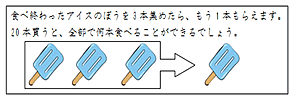 本時では,まずは右図のような「○○のいくつ分」で考えたくなる必然性をもった問題場面を提示する。そこで「いくつあるか。」という結果に注目しがちな子どもたちの疑問を,「どのように求めるか。」という過程に注目させるために,あえて間違った次のような式を提示する。