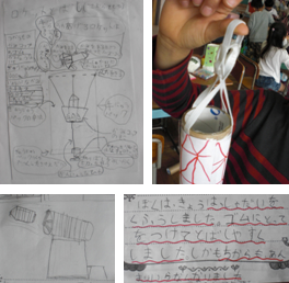 ゴムの力を利用したロケットを作ろうと考えたT児は,アイディアを元に詳しい計画書を作り,とても凝った仕掛けのロケットを作ろうとした。ロケット部分の細部装飾にこだわり,自分では満足したT児だったが,友達から「やり方がわかりづらい」「1年生にはやりにくい」という感想が出された。これらの意見を取り入れ,T児が考えたのは,持ちづらさを改善するために発射台をつけることだった。 また,引っ張りづらかったゴムに取っ手をつけ,「しかも力もあんまりいらなくなりました。」と振り返っている。「より高く」という科学的な考え方を進めるとともに「扱いやすい」「一年生が楽しめる」という視点が加わっている。