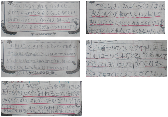 そこで,「身近にある物を使って手作りのおもちゃを作る」「1年生が遊びやすく楽しめる物を作る」という2点をしっかりおさえることで,活動の軸がぶれないようにした。「より高く飛ぶもの」「より速く進むもの」といった科学的な探究の中に面白さや自然の不思議を感じ取るとともに,「1年生に喜んでもらいたい」という情緒的な側面が加わることで,「遊びやすく」「こわれにくく」「安全に」などの工夫の視点が生まれ,児童の活動が広がり充実した。
