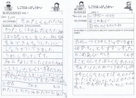 この単元の学習では,家庭の協力がかかせないものであったが,保護者は一緒に仕事をしたり「家での仕事大作戦」カードに励ましの言葉を書いたり協力してくださった。この学習が終わっても,「家での仕事大作戦」カードに何人も書いてきている。友だちの発表を聞いて,今までしていなかった仕事に挑戦してきた児童もいる。仕事をたくさんしてくる児童の中に,「仕事は難しいけれどやっていたら楽しくなった」「最初はどうやったらいいか分からなかったけどやっていたら上手になった」という感想を書いている子が何人もいた。このことから,できなかったことができるようになった喜び,家の人と一緒に仕事をする楽しさ,役に立てたという満足感などがうかがえる。家族はみんな大好きなので,お家の人に喜んでもらうために冬休みにどんな仕事をするかを決めて,簡単に記入できる仕事カードを作って仕事に挑戦させた。仕事に意欲を燃やし進んで仕事をするようになった児童もいるが,中にはあまり仕事をする気がない児童もおり,このような児童にどう働きかけたらいいか考えていかなければならない。