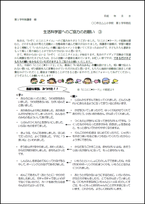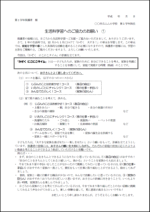 まず,単元の初めに,単元のねらいや活動の進め方について家庭に知らせ,協力を依頼した。協力依頼文にはできるだけ具体的な例を挙げて分かりやすく説明し,家庭との情報交換を密にするよう努めた。
