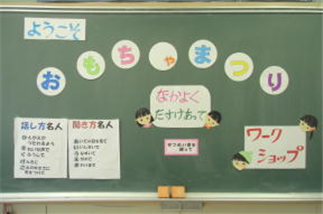 | ○ 学習課題をつかみ,学習の見通しを持つ。 ・1年の時に「おもちゃまつり」に招待されて遊んだ活動を想起する。 ・実際にいろいろな手作りおもちゃで遊ぶ ・おもちゃの種類によって使う材料や遊ぶ場所(机,床,空間など)が異なることを確認する。 ・どんな「おもちゃまつり」にしたいか活動内容について話し合う。 |