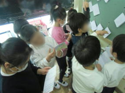 | <みんなであそぼう> (5時間) ・作ったおもちゃの遊び方や,そのルールを確認して,遊ぶ準備をする。 ・説明書を活用して「第1回おもちゃまつり」を開く(クラス全体で) 写真資料3 ・課題を話し合って改善策を考える。 ・遊びの相手を広げたり,おもちゃの作り方も伝えたいという願いをもとに1年生を招待して一緒に遊ぶ計画や準備をする。 (伝える相手と目的意識を確認) |