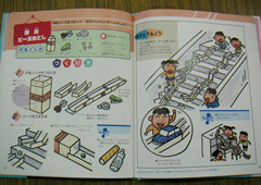 つぎに,教育テレビ番組「ピタゴラスイッチ」を見て材料を検討し,構想を練った。図書館司書の先生に協力を依頼し,関連の本やインターネットを使って調べる方法を教えてもらった。話し合いの結果,ビーダマ迷路担当の「ビーダマ作戦チーム」,ドミノ倒し担当の「ドミノ作戦チーム」,びっくりする仕掛け担当の「びっくり作戦チーム」の3グループに分かれ,まずは「ピタゴラスイッチミニ」を作ることになった。各グループのアイデアにより,続々と必要な材料が集められた。地域の木材や竹は,児童の家族の方が提供して下さった。