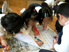 3学期は,保育園の先生方の協力を得て,保育園の友達を小学校に招き,子どもたちが「お兄さん・お姉さんとして年下の友達を助けてあげたい」と自覚できるような機会をたくさん設けた。また,「ピタゴラスイッチ」のような大きな工作ではないが,喜んでもらえるような「飾り付け」や「メッセージカード」などのプレゼントを用意することになった。1つ上の学年,2年生の友達といっしょに教室を飾り,入学式では,歓迎アトラクション「1年生になったらこんなことができるよ」を発表した。