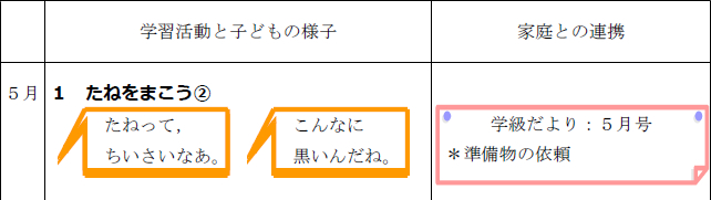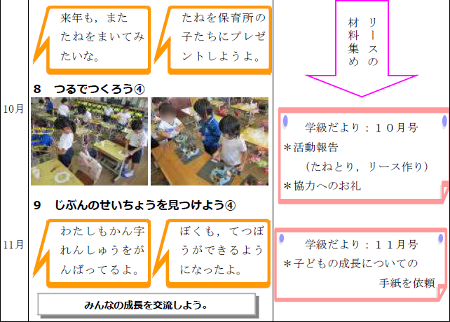 そこで,上記の3点を実現するためには,1年間の単元構成を明確にし,具体的活動を工夫し,長期的な活動を展開することが有効であると考えた。そして,長期的な学習活動の実現には,子どもの主体的活動のための意識の継続と家庭との連携が必要不可欠であると考え,実践することとした。