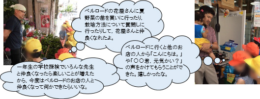 【工夫①】 夏野菜の栽培活動中,ベルロードの花屋さんで苗を買った経験から,スムーズに「まちたんけん」へ流れを作る。 | |||
