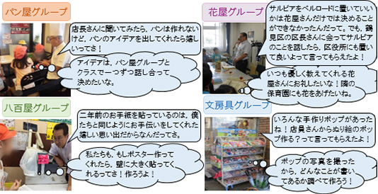 【工夫⑬】 子ども達に達成感を味あわせるために,店にポスターやポップなどを掲示してもらうだけでなく,お客さんからの反応がどうだったかを次回のインタビューで子ども達に伝えてもらえるようお願いをする。 | |||