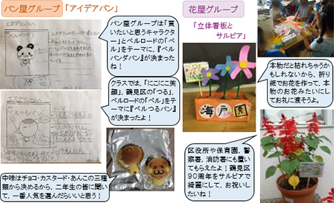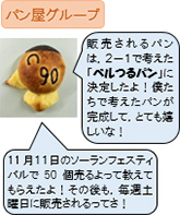 【工夫⑪】 パンが完成するまでの日程を打ち合わせ,パンの完成日や販売予定日などを店長さんと確認し,先の活動の見通しをもつ。 【工夫⑫】 国語「しかけカードをつくろう」の学習など,他教科等の関連を図りながら,図工の表現などで身につけた知識や技能を使って活動する。 | |||