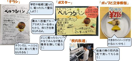 【工夫⑮】 パン屋以外のグループの成功体験をもとに,パン屋グループの活動が発展していくように情報を交流する場を設定する。 【工夫⑯】 各宣伝方法の意図を明確し,宣伝媒体を作るだけでなく,ポスターを貼る時に効果的な場所やチラシの配布方法,校内放送のタイミングなどを考える時間を保障する。 | |||