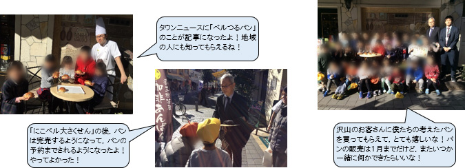 【工夫⑧】 子どもが自分達で課題を解決するために,区役所と連携し,事前に区長さんの学校訪問の日程を確認し,インタビューの機会を設定する。 【工夫⑨】 子どもの思いを見取った上で,事前にお店にポップやポスター,パン作り等の活動ができるかの確認とお願いをする。 | |||