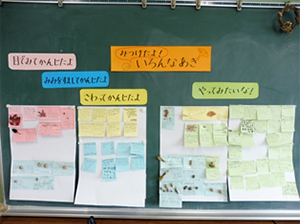 学びを見つめる場として,学習カードを書き,グループや全体で共有したりふり返ったりし,次時のめあてを話し合うようにした。カードによって,個々の発見や疑問を可視化することで,自己の考えがいっそう明確になり,交流のツールとしても活用できると考えた。また,児童が課題を焦点化したり,習得した知識をつなぎ豊かに思考したりすることで深い学びに迫ることができると考え,教師は,思考の収束と拡散を促す働きかけを行った。