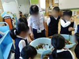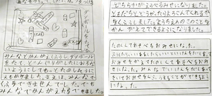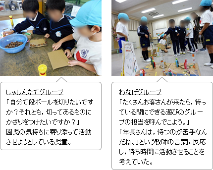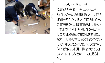 附属幼稚園と連携し,現1年生が年長時にした活動を聞き取り,今年度は,それらをより発展させることができるように活動を方向付けた。 また,本年度の園児が行っている活動を聞き取り,活動のめあてや内容について,小学校との差別化を図るように計画を立てた。 附属幼稚園とは,年間を通して交流を重ねていき,複数回にわたる関わりを通して自分への気づきを深めていけるように,季節によって遊ぶものや遊びを替え,ふり返り活動を充実させた。 |