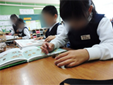 図書を使って見つけた自然物を調べる児童。木の特性や生態を知ると,似ている木を探しに出かけて行った。 |