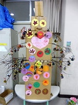 葉や枝,ススキ,まつぼっくりモンスターなどを飾り付けている。