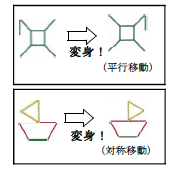 (2) 変身ゲームで「スー」「くるっ」「ぱたん」という言葉を言いながら,図形を動かすことで,図形の基本的な移動の仕方について,具体的に理解することができた。