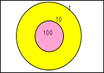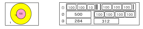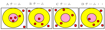 班ごとに玉入れの紙(上図)を準備するが,円の大きさや玉入れをする距離は事前にやってみて,必要とする数が出やすいようにする。また,回数は人数によって増やすか,1000を超えないようにする。 |