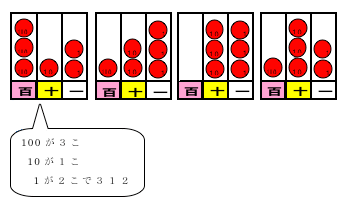 1000までの数の大小比較は,数の意味(よみ方,表し方,大小,順序)理解の一つの内容である。そこで,ここでは,数の範囲を3位数まで広げ,十進位取り記数法や数構成の考えを十分取り入れながら,数の大小比較をし,次第に上の位の数に着目させていくことが大切である。