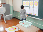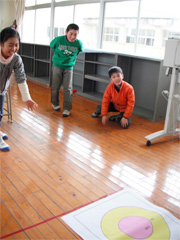 ![]() 玉入れの結果が見えるように,同じ紙を黒板にはり,入った場所にシールを貼らせる。