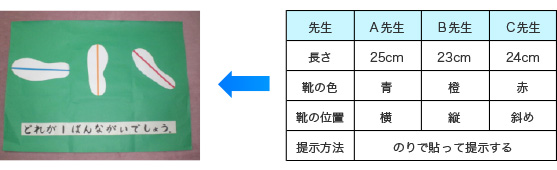 靴のサイズは,日頃,耳にしているため長さとしてとらえやすい。そこで,先生の靴の長さを位置や色を変えて提示することで,誰が一番長いか調べてみたいという測定の必要性がわき,意欲的に測定することができる。