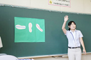 (1) 身近な先生の靴の長さ比べをすることで,「どの靴が一番長いか比べてみたい」という意欲が高まり,比べる方法を話し合い,測定活動へとつなげていくことができた。