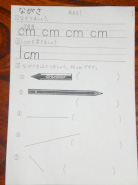 ![]() 普遍単位の必要に気づかせるために,1cm区切りは23cm,3cm区切りは24cm,5cm区切りは25cmを列ごとに与え,測らせる。