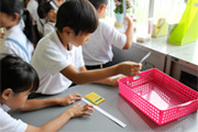 すぐにものさしを当てて測定するのではなく,これくらいかなと予想し,測らせるようにする。見付けられない児童には,教室や箱の中に10cmの物を準備してさりげなく置いておく。 |
