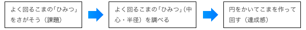 「こま回し大会をしよう」で興味関心がわき「よく回るこまのひみつは?」と問うことで,追究する意欲が出て自ら円の構成要素(中心・半径)に気づいていくことができる。