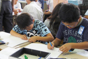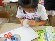 円をかく方法を考えさせた上で,本時は工作用紙に穴をあけた紙とピンでかかせる。早くできた子どもには,いろいろな大きさの円をかかせることで円の中心と半径の関係に気づかせる。 |