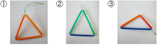 (1) ストローと園芸用紐で三角形をつくるという教具の工夫をすることで,一人 一人が楽しくいろいろな三角形を作ることができた。