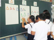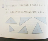 三角形の作り方は具体的に作って知らせる。 その場合,実態に応じて子どもから出にくいと思われる三角形を作る。ここでは,二等辺三角形を作ってみせた。 |