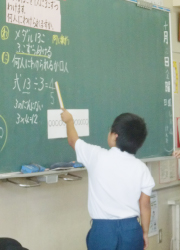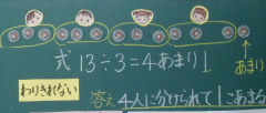 (1) 「何人に分けられますか」と言う問いは,初めて「あまり」に出会う児童の素直な迷いをひきだし,児童自らが,答えをどのように表すかや「あまり」の意味について考える活動へと導くことができた。