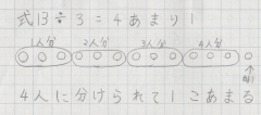 全体で式まで完成させた後,一人学びで図や式にまとめ,結びつけさせることで商やあまりの意味を理解させる。 |