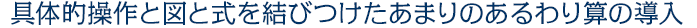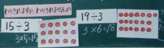 そこで,事象→具体物操作→図→式の過程を大切にすることで,これらが相互に結びつき,イメージ化できて,あまりの意味がより理解できると考える。