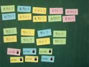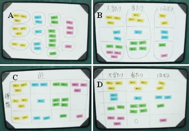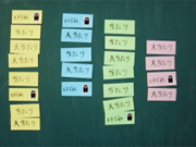 2人に1組のカードとホワイトボードを配布して,実際に考えたことを,カードを動かしながら整理させる。 |