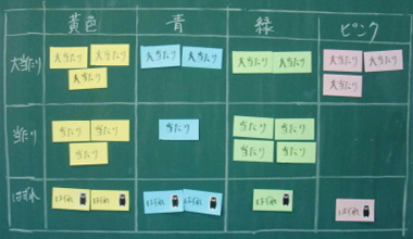 (1) くじ引きを行ったことで,「結果を知りたい。」「もっと分かりやすく整理したい。」という意欲がわき,興味・関心をもって考察する姿が見られた。色や種類の違うくじを用いたことで,2つの観点で分類・整理する必要感が自然と生まれ,その後の学習も意欲を持って活動することができた。