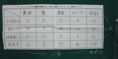 くじを引いた経験のある児童は多く,関心も高い。そこで,自ら二つの観点に気づくよう,色分けしたくじを準備する。